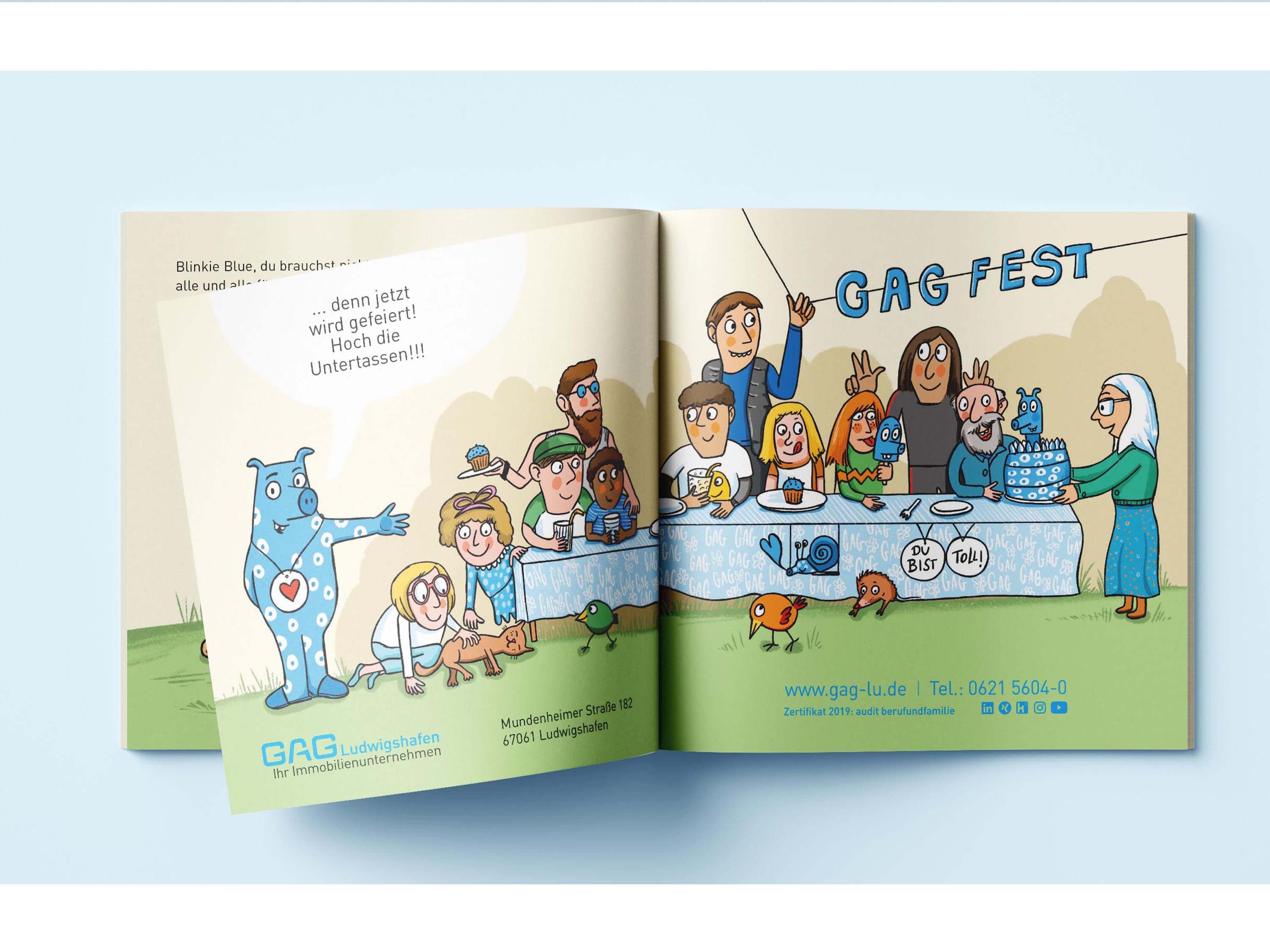 Die GAG verteilt die Büchlein gratis bei Sommerfesten und sonstigen Feiern direkt aus der Umhängetasche des Blinkie-Blue-WalkingActs, den ich auch entworfen habe, und den ihr bald hier (Link kommt) sehen könnt.