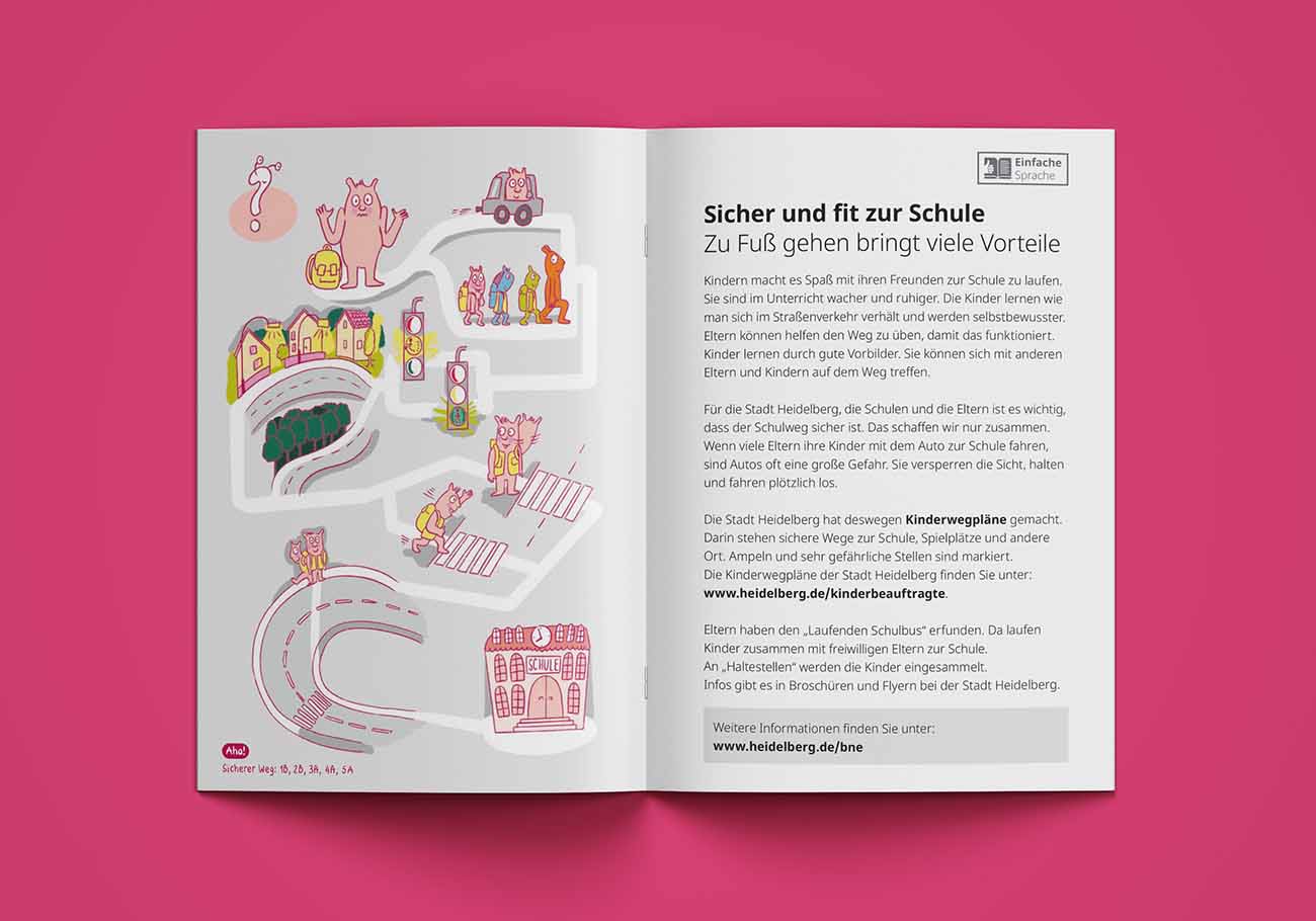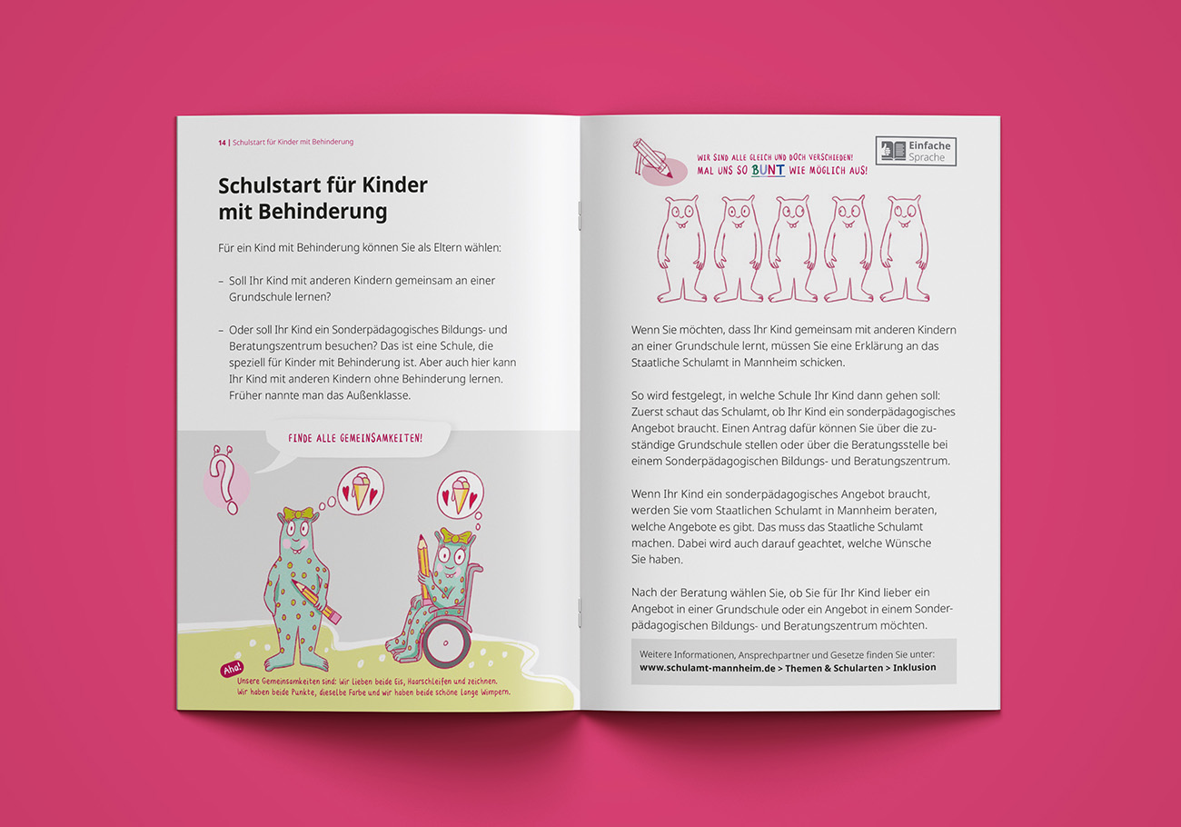 Naja, nicht die Einschulung, aber zumindest die Einschulungsbroschüre mit allen wichtigen Informationen ist jetzt dank eines großen Mitmachteils an Eltern und zukünftigen SchülerInnen adressiert. Den Kleinen wird so Lust auf Schule gemacht, sie erfahren, wie sie sicher in die Schule kommen (und zwar mit dem Laufbus und nicht mit dem Eltern-Taxi), sie finden lustige Seiten zum Ausmalen und viel Platz, um ihr Wissen rund ums Thema Schule zu testen (Schultüte, Brotbox ...). Durch die Broschüre, die an alle Haushalte in Heidelberg mit Einschulungskindern geht, führen jetzt süße Monsterchen, die sich auch mal beim Vorwort an den Oberbürgermeister schmiegen. Und das tolle: Ein Teil der Broschüre ist in einfacher Sprache verfasst. Viel Spaß, ihr Lieben, und viele Grüße an den Ernst des Lebens!