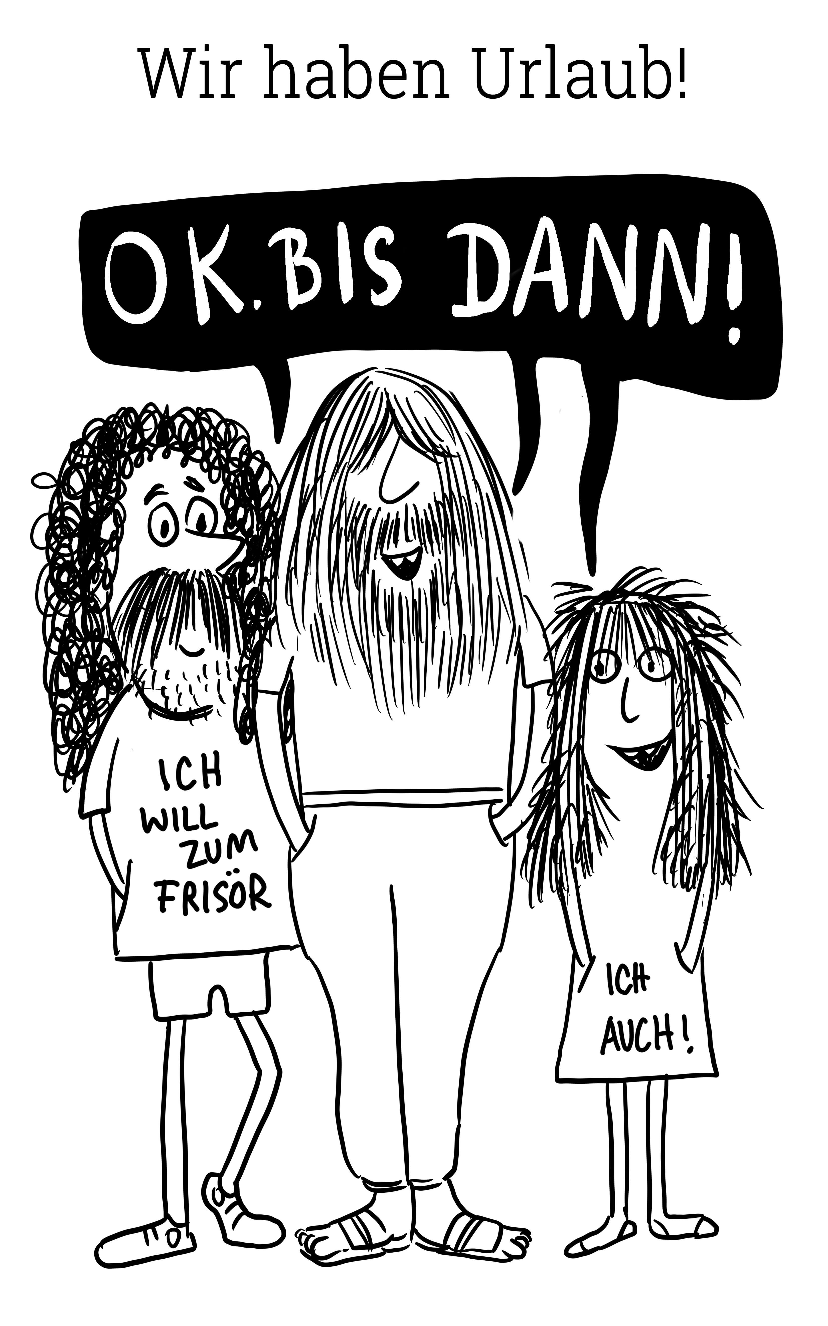 Der Frisör bei mir an der Ecke macht kurz den Laden zu, weil er im Urlaub ist. Da hab ich ihm ein Schildchen für die Kunden gemacht, für die langhaarigen und die wirklich Verzweifelten. Also dran denken: Rechtzeitig Termine machen!
