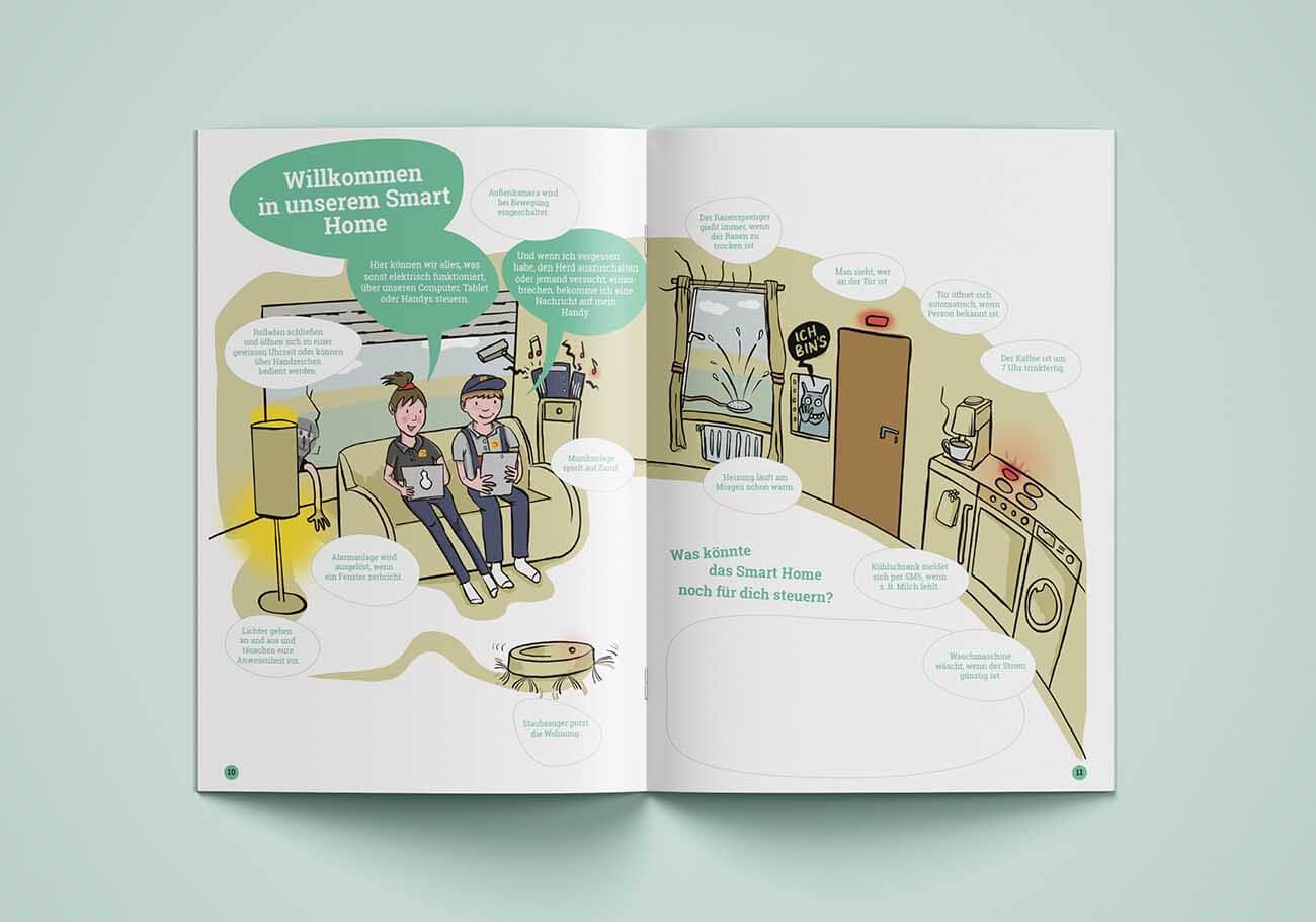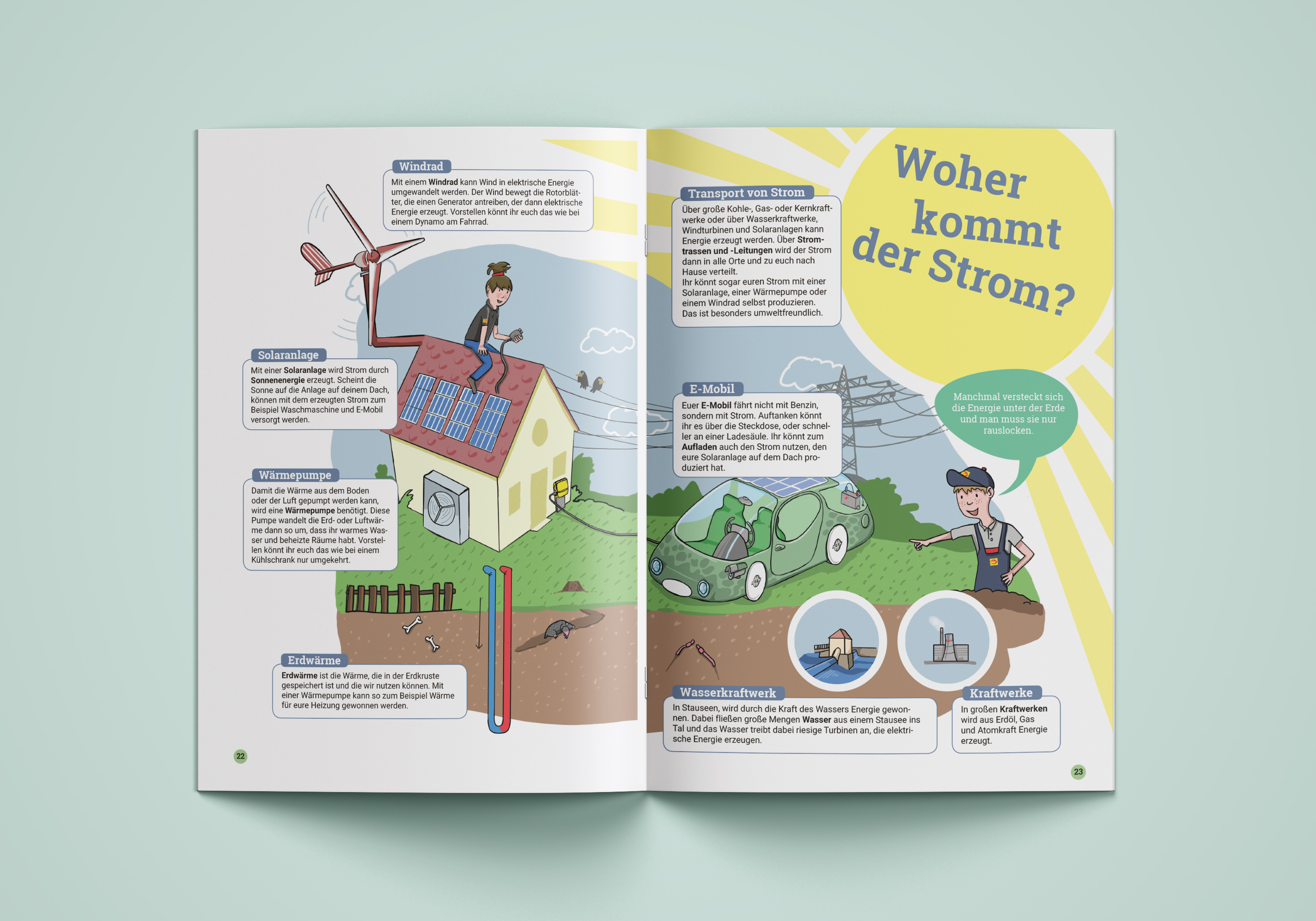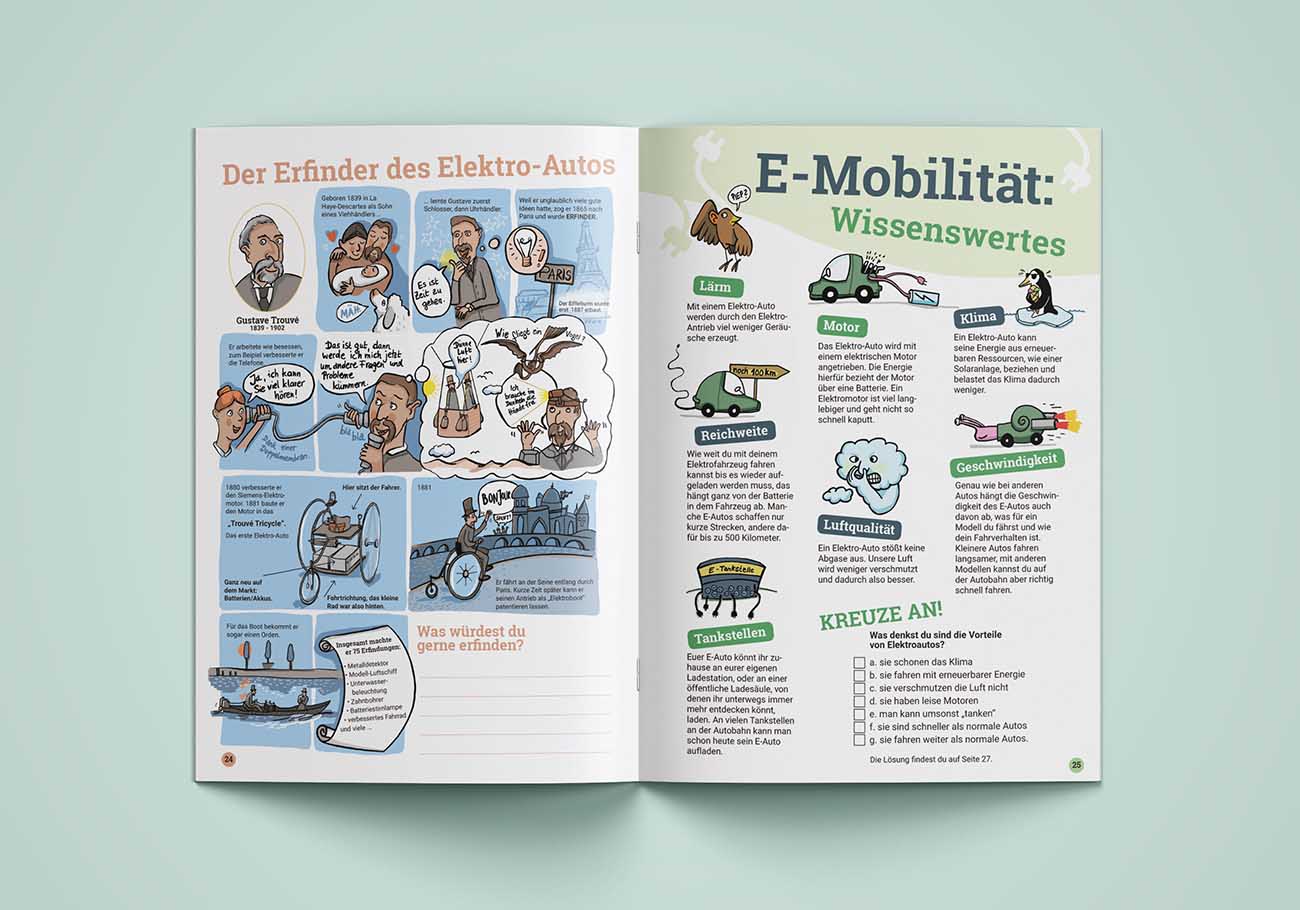 Ein Mitmach-Buch für den Zentralverband E-Handwerk. Was passiert bei einem Gewitter, wer hat das erste Automobil erfunden, was ist ein Smart Home? In dem 28-seitigen Mitmach- und Ausmalheft für Grundschulkinder zwischen 6 und 10 Jahren werden Alltagsphänomene mit Bezug zum Thema Elektronik erklärt. Dabei können aber durchaus auch dem Schulalter entwachsene Menschen viel Wissenswertes erfahren. Ich habe bei der Recherche und Entwicklung der Bilder und Ideen selbst eine Menge gelernt. Kein WAS IST WAS-Elektrobuch war vor mir sicher, ich habe mir alle aus der Bibliothek ausgeliehen.