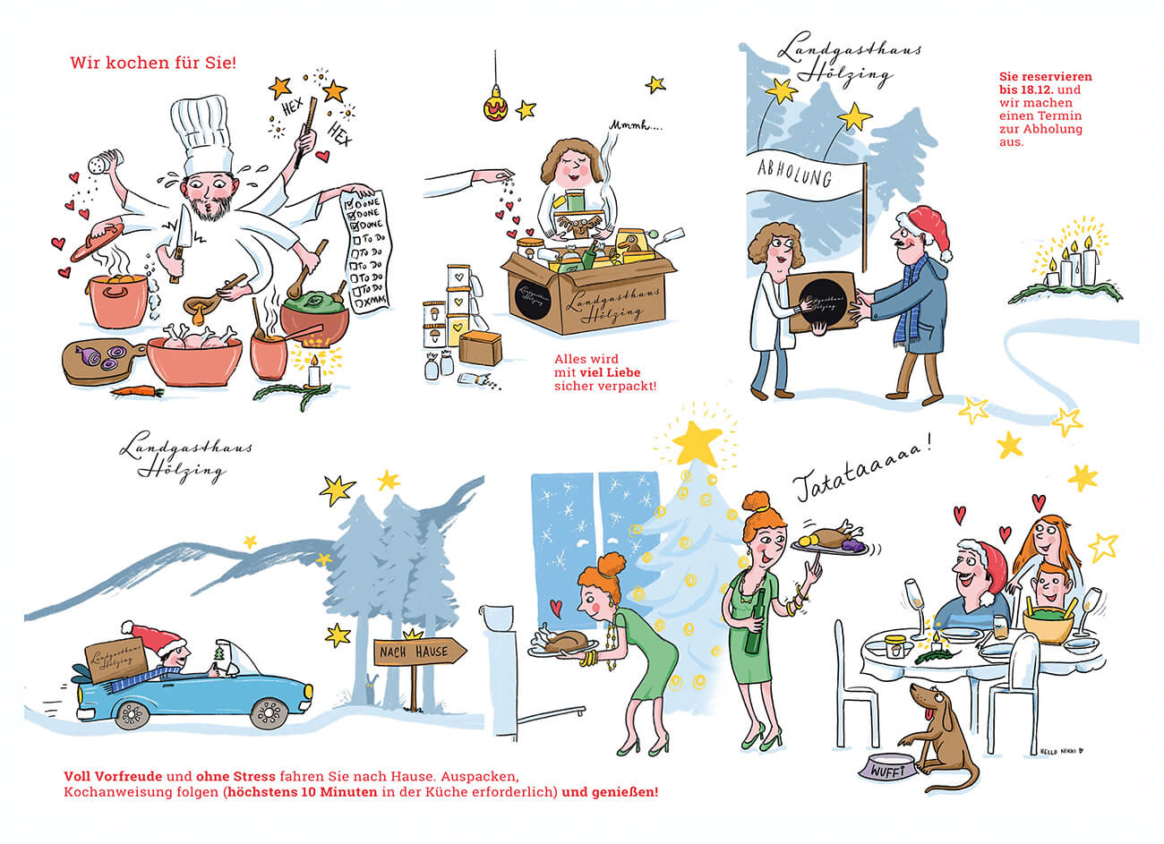 "Wir kochen – Sie holen!" sagte der Landgasthof Hölzing im ersten Lockdown. "Das wunderbarste Weihnachtsmenü mit Leichtigkeit gezaubert – natürlich in gewohnter Hölzing-Qualität." Diese Botschaft kam an und fand großen Anklang. Die Illustration wurde sowohl gedruckt verbreitet als auch in den sozialen Medien.