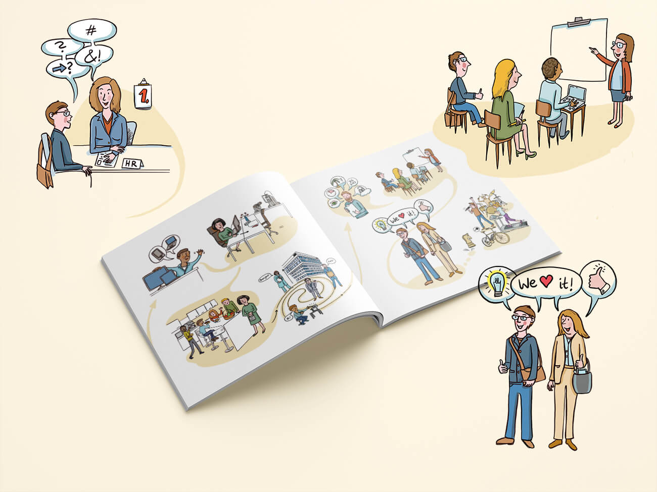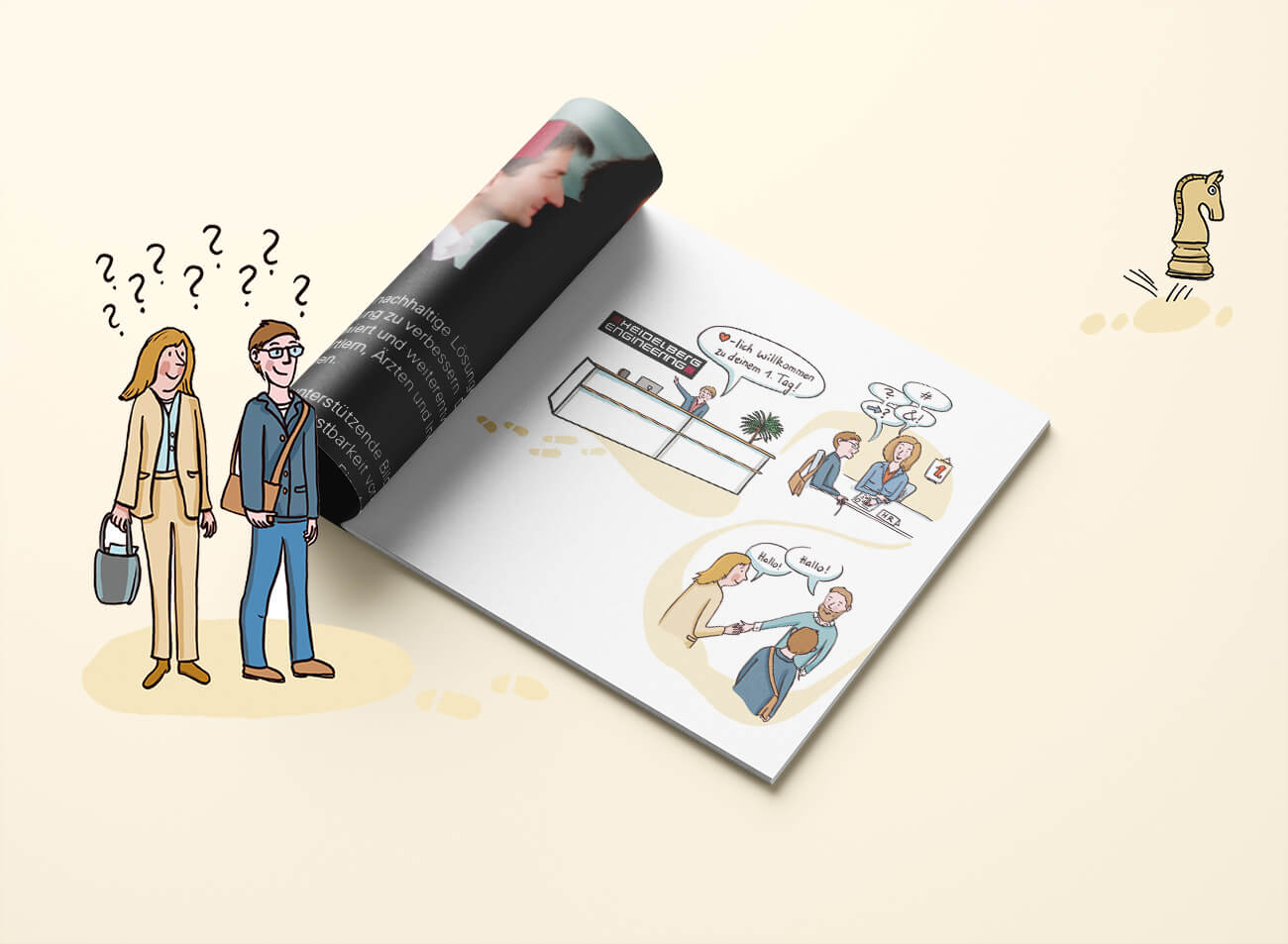 Fängst du als neuer Mitarbeiter/in bei Heidelberg Engineering an, bekommst du zur Vorbereitung und Begrüßung eine persönliche Mappe zugesandt. Das ist schonmal sehr nett. Da der erste Tag mit Arbeitsmittel-Ausstattung, Kennenlernen der Kolleg/innen, Rundgang und Schulungen relativ gleich verläuft, wurde dieser Teil der Mappe mit meinen Illustrationen aufgelockert und verschönert.