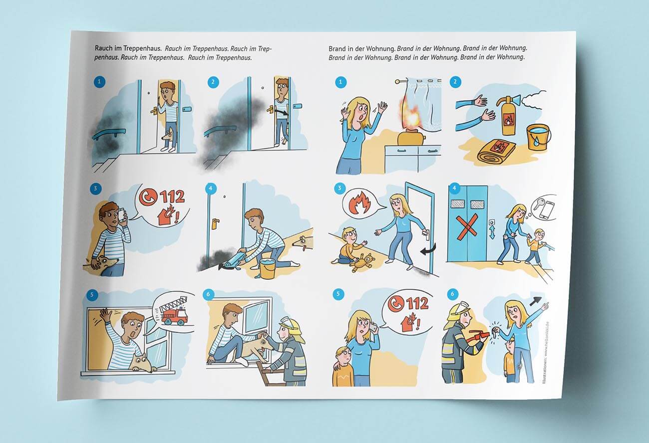 Brandschutzflyer für die GAG Wohnungsbaugesellschaft Ludwigshafen. Nur die Überschrift wurde für die Multikulti-Mietergemeinschaft in fünf Sprachen übersetzt. Ansonsten waren für die wichtigen Anweisungen für einen Notfall keine Worte nötig.