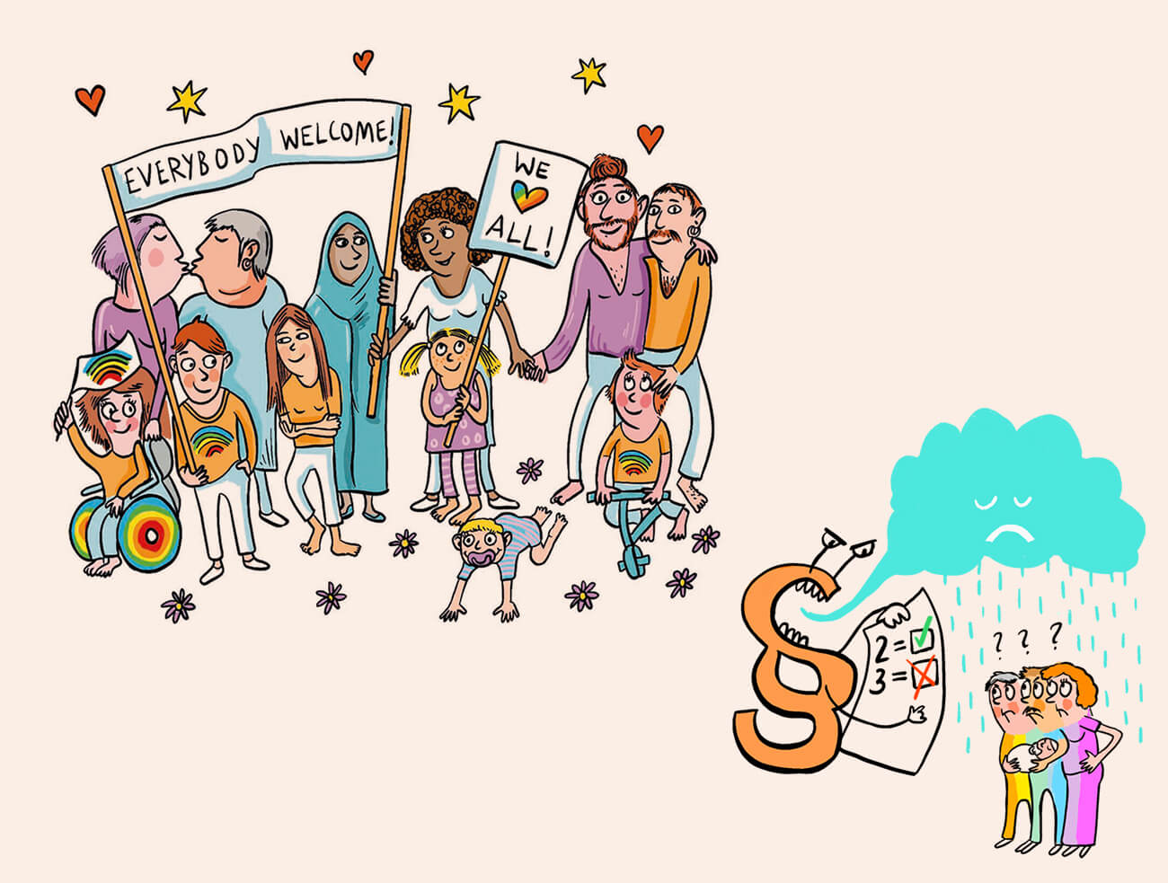 Wenn Themen kompliziert werden, kommt man mit Fotos nicht mehr weiter. Aber Illustrationen können auf einer ganz anderen Ebene kommunizieren, und eine Broschüre mit viel Text ganz wunderbar untermalen. Herausgeber: Queeres Netzwerk NRW e.V., danke an Granadahills Studio für die tolle Zusammenarbeit.