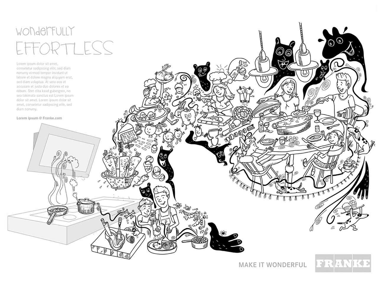 Wimmelbild für Küchen-Ausstattung. Franke mit Sitz in der Schweiz ist ein Unternehmen für hochwertige Design-Küchenausstattung. Für jede Produktlinie hat eine andere Illustratorin bzw. ein anderer Illustrator, eine Art „Küchen-Wimmelbild“ entworfen. Dieses Bild entstand als Wanddeko für eine Messe und für eine Anzeigen-Kampagne.