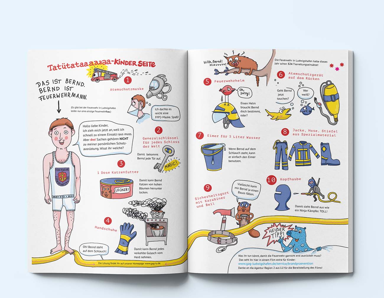 Thema: Feuerwehr. Hier wird genau aufgezählt, was zur persönlichen Grundausstattung eines Feuerwehrmanns/fraus gehört. Drei Dinge sind dabei einfach frei erfunden. Die Lösung finden die Kinder auf der Homepage der GAG.
