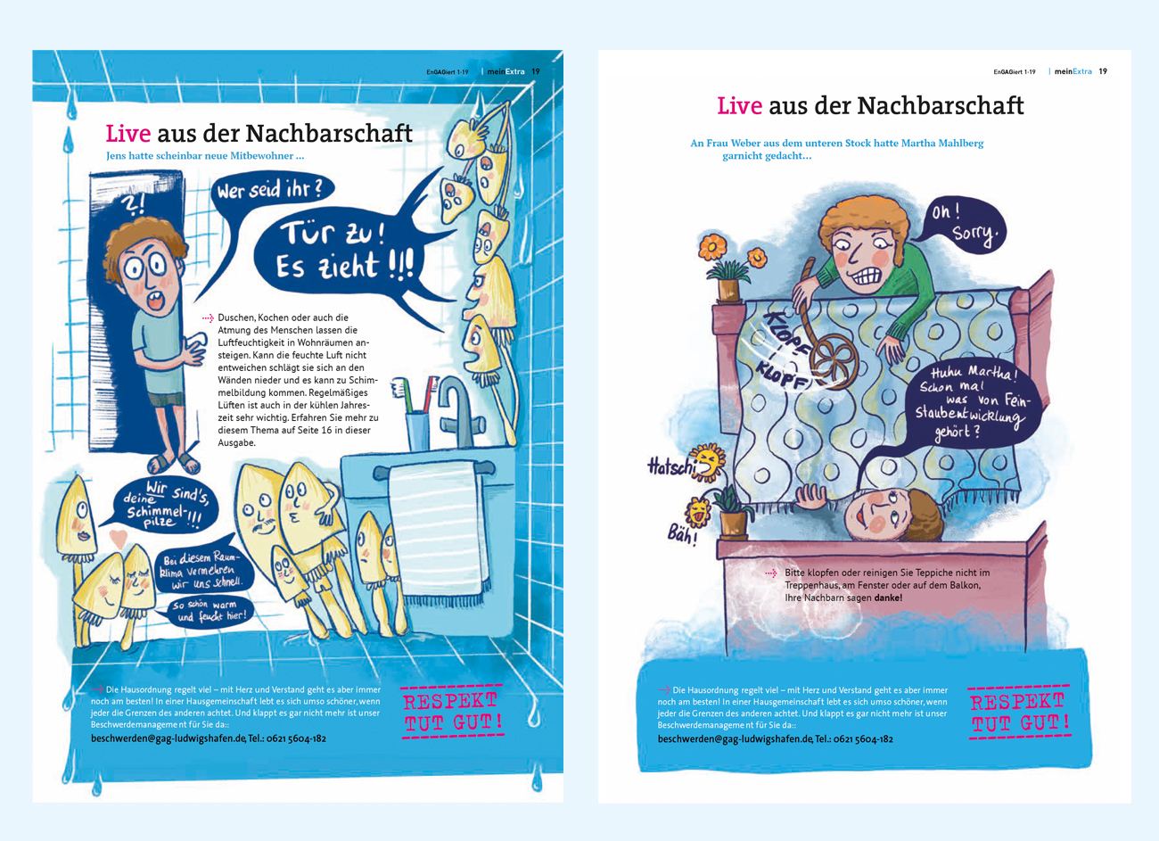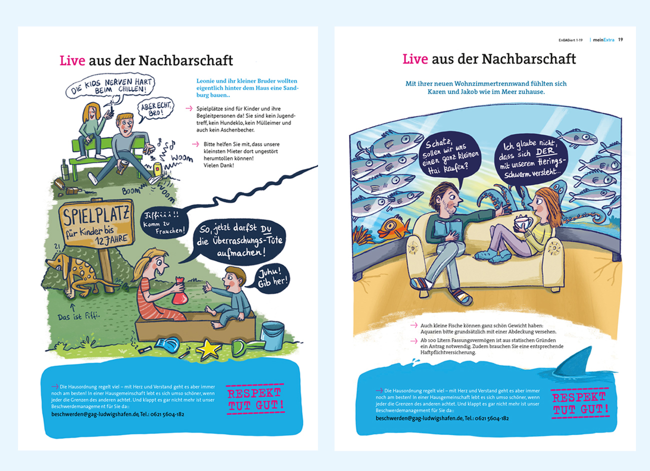 Die letzte Seite des Kundenmagazins der GAG Wohnungsbaugesellschaft Ludwigshafen gehört mir! Das Magazin erscheint sechs Mal im Jahr. Unter dem Motto „Respekt tut gut!“ habe ich bislang Cartoons zu Themen des Umgangs- und Miteinanderlebens auf humorvolle Weise und ohne erhobenen Zeigefinger angesprochen. Nach drei Jahren haben wir das Konzept nun umgestellt und ich zeichne eine Doppelseite für Kinder mit unterschiedlichen Themen zum Mitmachen, Rätseln und Ausmalen. Dafür entstand eine Sympathiefigur – das Blinkie Blue.