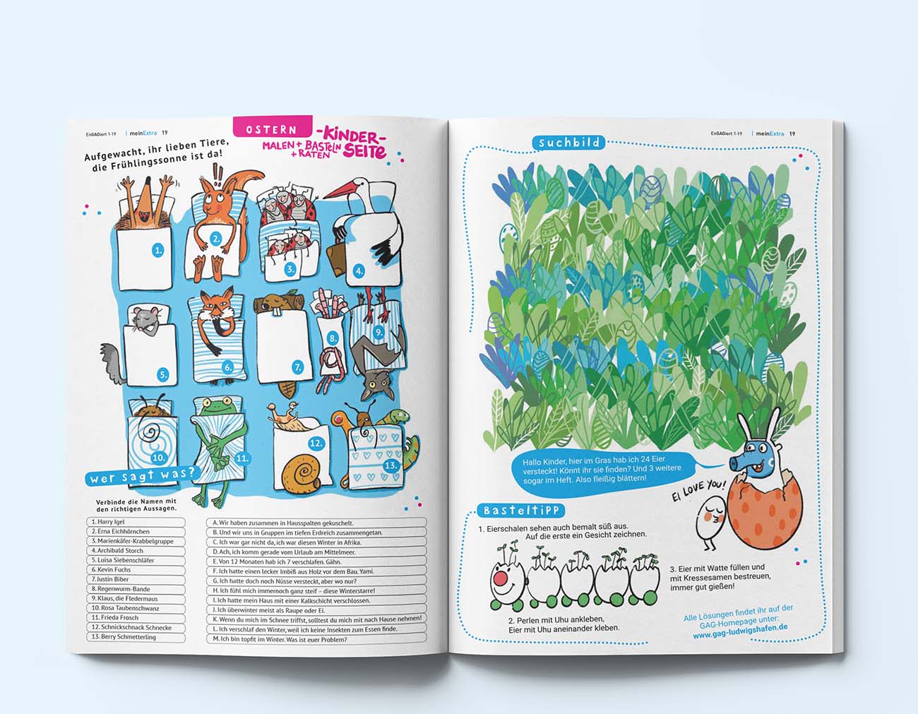 Thema: Winterschlaf. Wer schläft wie lange, wer vielleicht gar nicht und wer flieht in wärmere Gefilde? Und wie ist das mit dem Frühlingserwachen? Auch "einfache", aber kurzweilige Spiele und Basteltipps finden Platz in der neuen Kinderseiten-Sparte des Kundenmagazins.