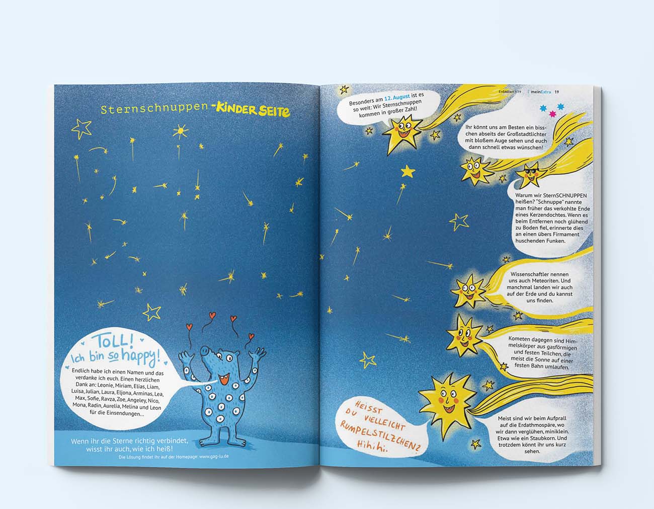 Thema: Sternschnuppen. In einer vorherigen Ausgabe durften die Kinder Namen für das neue Maskottchen vorschlagen. Hier erfährt man durch richtiges Verbinden der Sterne den ausgewählten Namen: Blinkie Blue. Dabei erfahren die Kinder nebenbei so einiges Wissenswertes über Sternschnuppen.