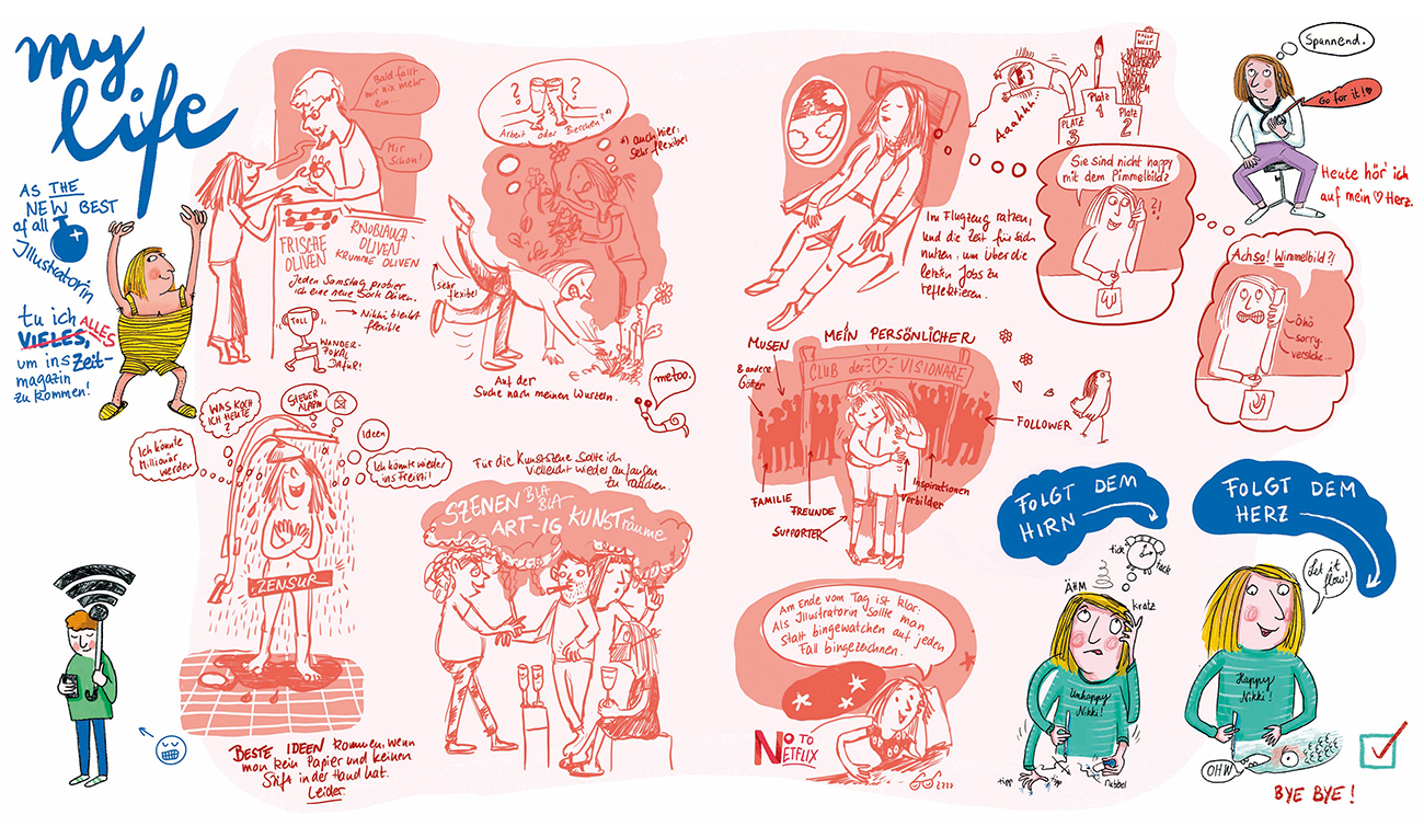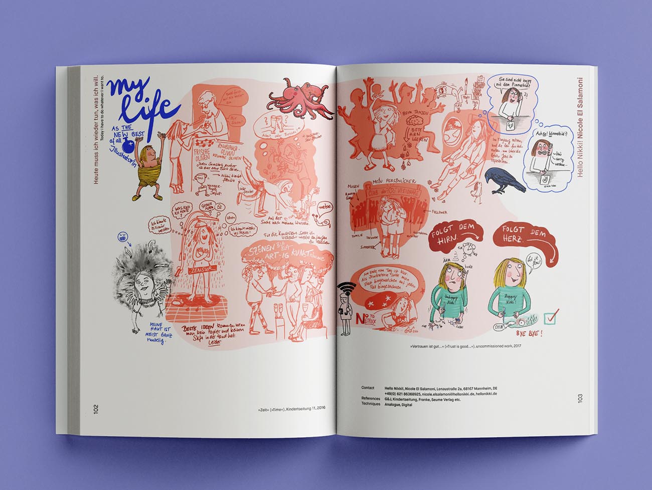 Freistil, das Buch der Illustrator*innen. Das Illustrations-Jahrbuch erscheint unregelmäßig seit 2003. Alle zwei bis drei Jahre versammelt Raban Ruddigkeit starke Positionen aus der Illustrationsszene und scoutet neue Talente. Ich durfte eine Collage aus meinen aktuellen Arbeiten beisteuern, die eine Doppelseite einnehmen. Hier habe ich meinen cartoonartigen Stil gezeigt und ein Best-of aus meinen Tagebüchern ausgewählt. Um meine witzigere Seite zu zeigen. Ich weiß schon, was ich das nächste Mal einreiche! :-)