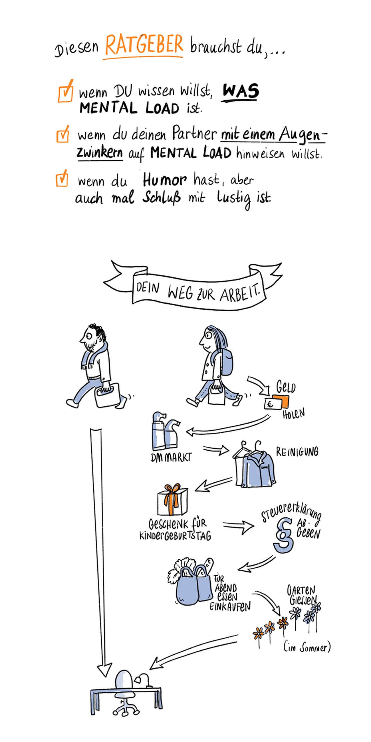 Mental Load? Denk-Streß? Also ich hab das nicht! Ich arbeite ja einfach in meinem Traumberuf, hab nur ein einziges Kind und mein Mann hilft mir viel. Aber je mehr ich mich mit dem Thema beschäftigt habe, je länger ich mich umgesehen und umgehört habe, je mehr Podcasts, Studien und Bücher ich zu dem Thema gelesen/gehört habe (was ein Rabbit Hole), desto mehr dachte ich: wir müssen über das Thema dringenst reden. Aber bitte ohne erhobenen Zeigefinger, dafür mit einer ordentlichen Portion Humor. Willst du genau wissen, ob du dieses Buch brauchst, dann besuch mich auf was-ist-mental-load.de