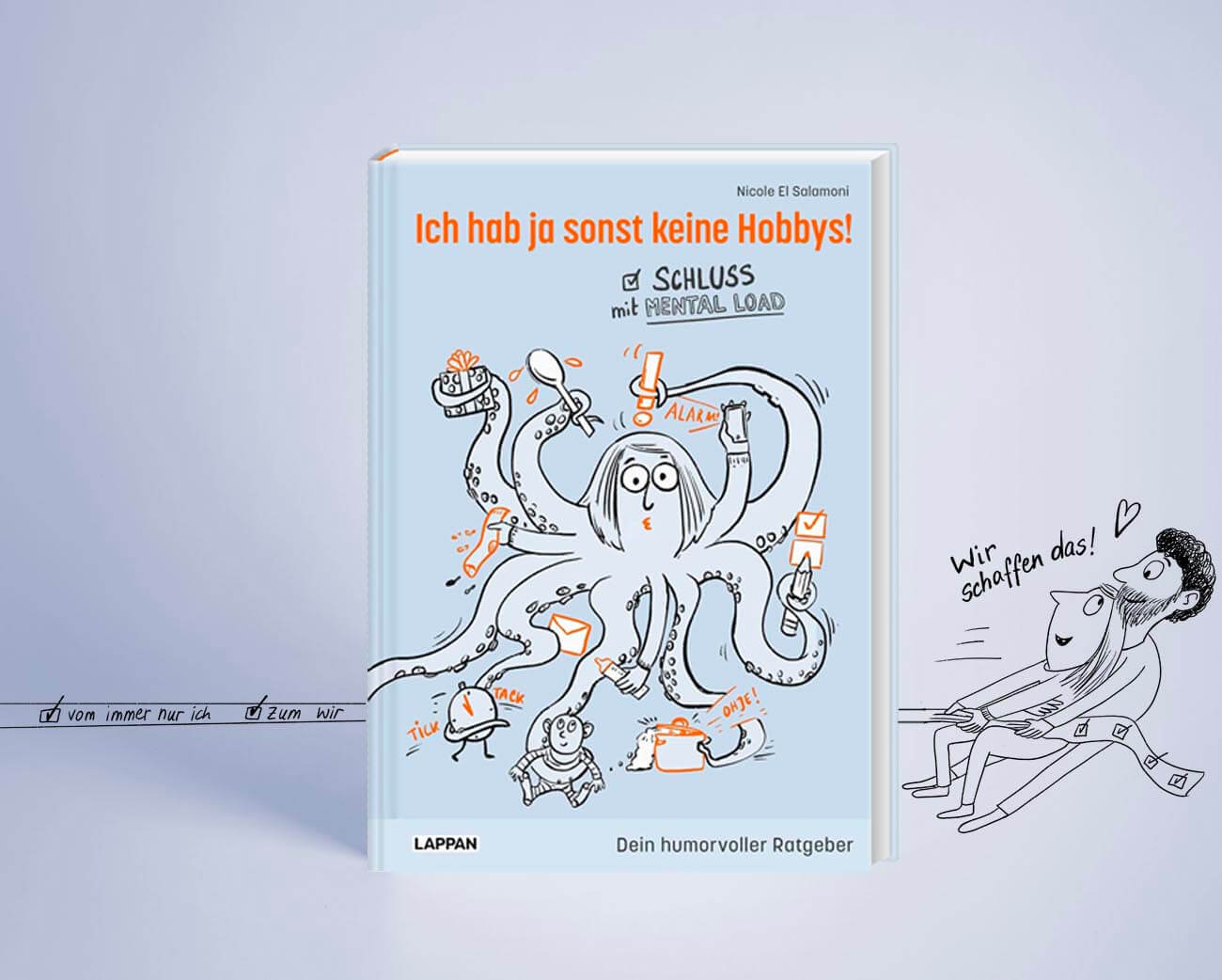 Kindergeburtstag organisieren, an Arzttermine denken, Schulbrote schmieren, Wäsche waschen und einkaufen. Die scheinbar unendlichen To-Do-Listen und der Mental Load im Familienalltag werden immer noch überwiegend von Müttern bewältigt. Nicole El Salamoni ist da keine Ausnahme. In ihren Zeichnungen hält die Illustratorin und Mutter eines Sohnes Geschichten aus ihrem Alltag und dem ihrer Freundinnen fest. Die Mitmachseiten im Ratgeber mit kleinen alltagstauglichen Übungen und Tests regen zum Reflektieren und Schmunzeln an und bilden eine gute Basis für die weitere Aufteilung der Arbeits- und Verantwortungslast in der Familie. Auch eigene Gedanken und Lösungsansätze finden ausreichend Platz.