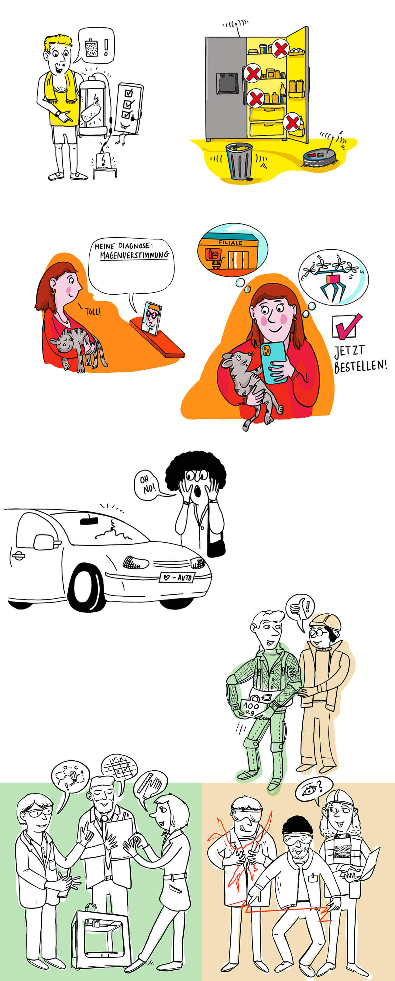Für meine Kunden zeichne ich immer wieder Zukunftsmusik. Das heißt ich verbildliche Prozesse, Produkte, Erfindungen, Utopien und Ideen. Mit meinen Illustrationen kann ein Ist- und einen Soll(te)-Status anschaulich für Vorstände, Kunden oder Mitarbeitern visualisiert werden. Habt ihr so einen Auftrag für mich? Bei Interesse schicke ich Euch auf Anfrage ein PDF mit mehr Beispielen gerne persönlich zu.