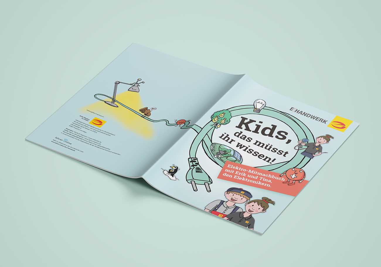 Ein Mitmach-Buch für den Zentralverband E-Handwerk. Was passiert bei einem Gewitter, wer hat das erste Automobil erfunden, was ist ein Smart Home? In dem 28-seitigen Mitmach- und Ausmalheft für Grundschulkinder zwischen 6 und 10 Jahren werden Alltagsphänomene mit Bezug zum Thema Elektronik erklärt. Dabei können aber durchaus auch dem Schulalter entwachsene Menschen viel Wissenswertes erfahren. Ich habe bei der Recherche und Entwicklung der Bilder und Ideen selbst eine Menge gelernt. Kein WAS IST WAS-Elektrobuch war vor mir sicher, ich habe mir alle aus der Bibliothek ausgeliehen.
