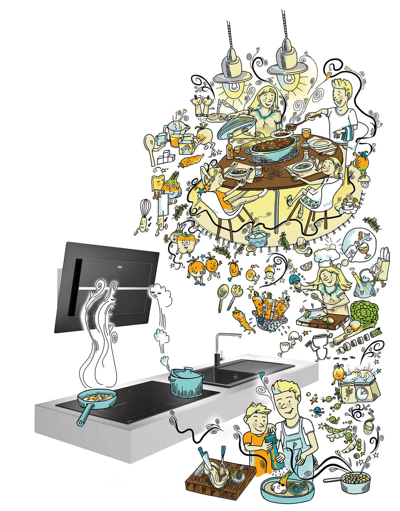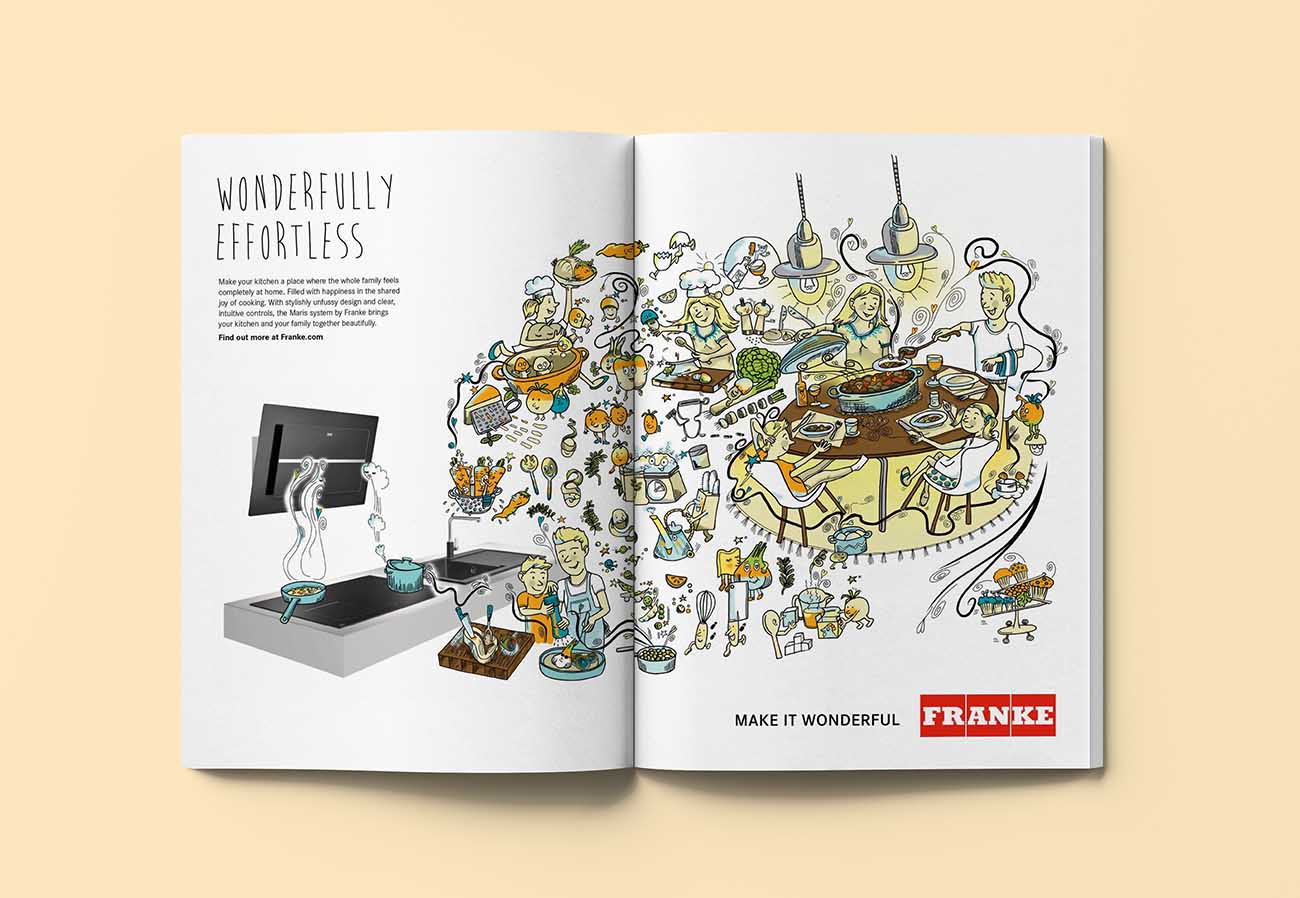 Wimmelbild für Küchen-Ausstattung. Franke mit Sitz in der Schweiz ist ein Unternehmen für hochwertige Design-Küchenausstattung. Für jede Produktlinie hat eine andere Illustratorin bzw. ein anderer Illustrator, eine Art „Küchen-Wimmelbild“ entworfen. Dieses Bild entstand als Wanddeko für eine Messe und für eine Anzeigen-Kampagne.