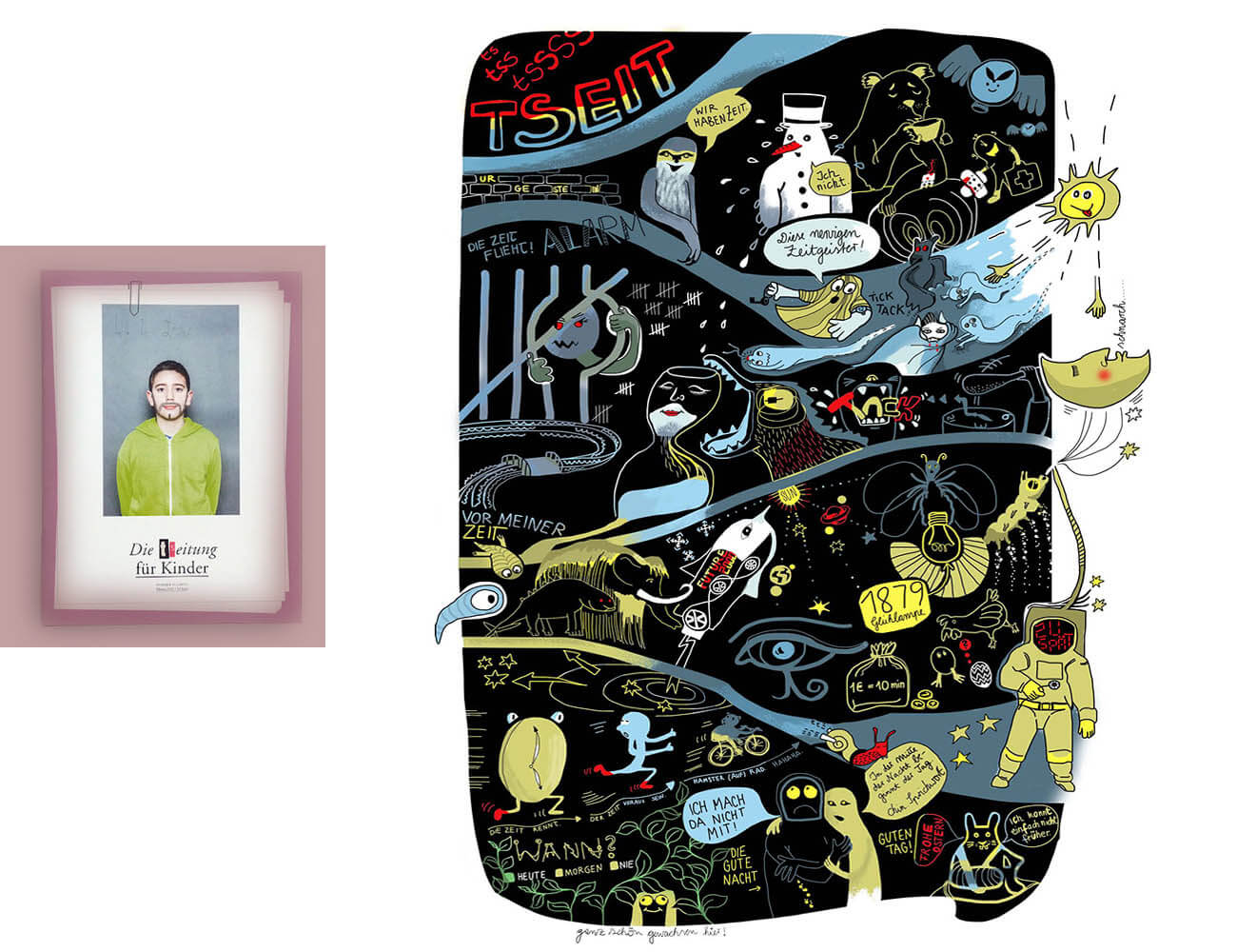 Ich bin in den Ausgaben RUND, GRÜN und ZEIT vertreten. In der Ausgabe RUND mit der „Mutter“ – also der allerersten – meiner großen Schwarz-weiß-Themen-Zeichnungen, eine Reise um den Globus. Beim Thema ZEIT habe ich verschiedene Sprichwörter aufgegriffen. Zur Ausgabe GRÜN habe ich ein Ausmalbild beigesteuert.