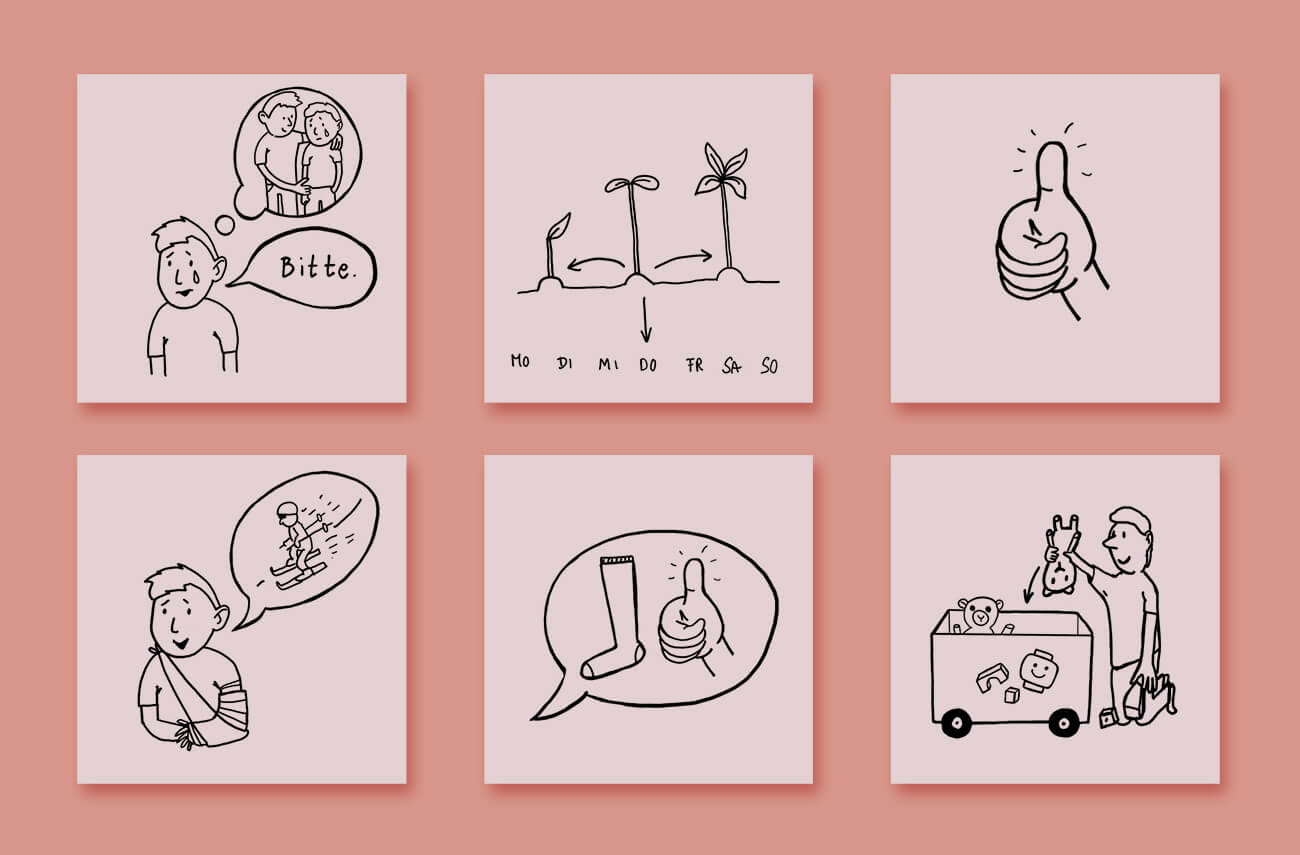 Für die Sprachförderung der Stadt Heidelberg ist dieser Lernkoffer entstanden. Die Professorin Anne Berkemeier von der PH Heidelberg hat das Konzept zum Sprachelernen entwickelt. Entstanden sind bisher 500 Bildkarten (Attribute, Verben, Substantive), Lehrbücher und somit ein ganzer Sprachkoffer, den man für Schulklassen erwerben kann, und der stetig um weitere Sprachfelder erweitert wird. Mit diesen Materialien ist es zum einen möglich, Deutsch zu lernen, zum anderen auch den Stand der Sprachkenntnisse abzufragen. Das neue Konzept wurde mit Kindern von Geflüchteten ausprobiert und weiterentwickelt. Am meisten Spaß hat mir das Illustrieren der Verben gemacht, obwohl ich dabei ganz schön um die Ecke denken musste. Gerade Hilfsverben wie „können, müssen, sein“ waren eine Herausforderung, die ich aber zu gerne angenommen habe!